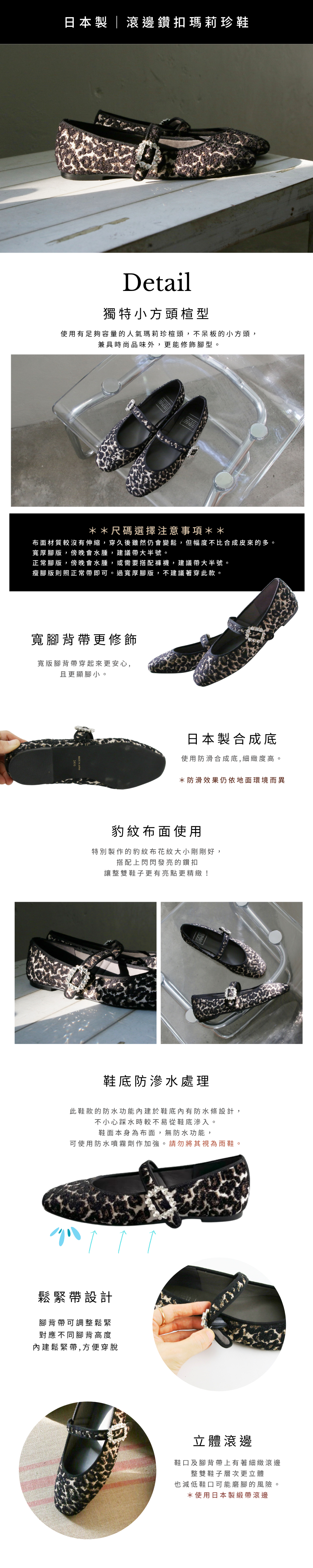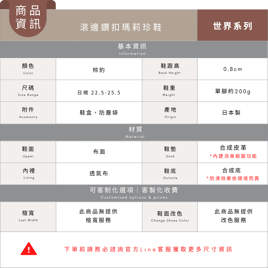 商品詳情 因工期較長,換貨又需重新等待40-60工作天 本檔僅提供七天鑑賞期退貨服務,無換貨服務,可接受再下單 【瑪莉珍團購】【棕豹】世界系列_晴雨兩穿_日本製滾邊鑽扣瑪莉珍鞋 TWD $4,080 TWD$ 3,850