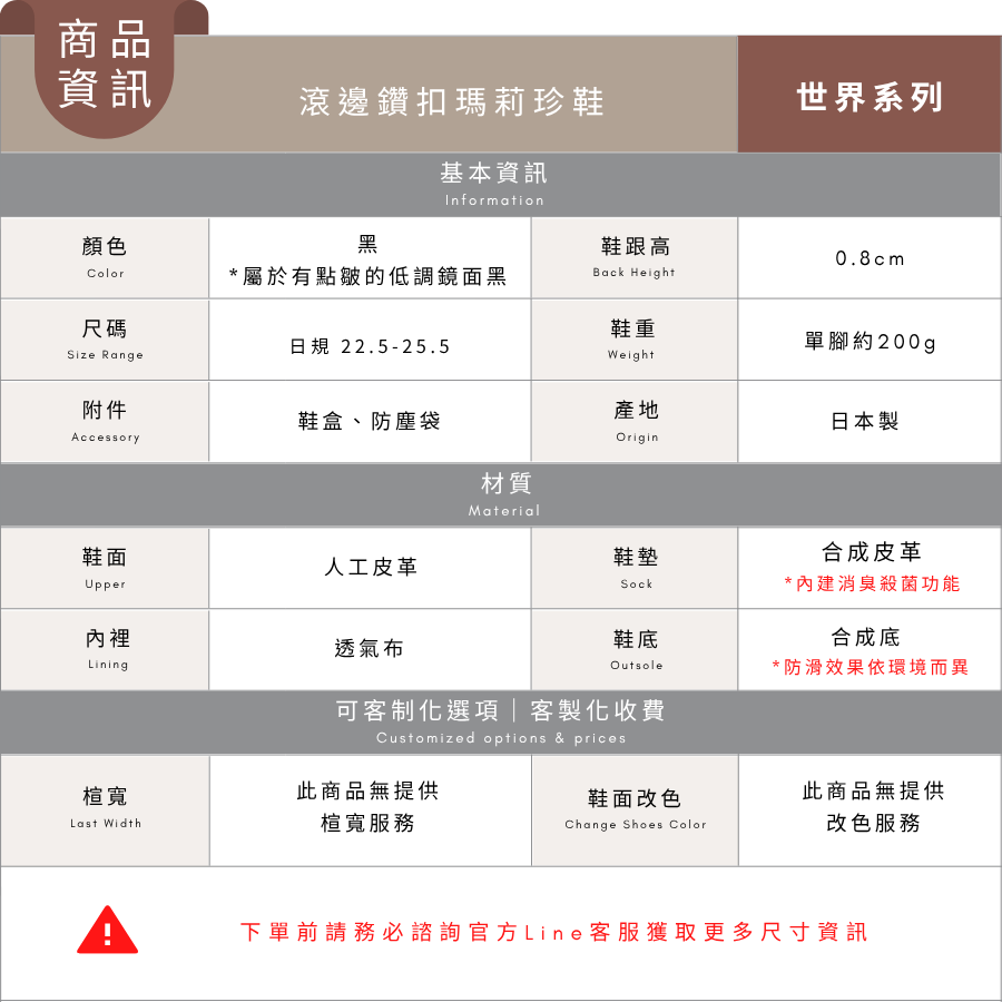 商品詳情 因工期較長,換貨又需重新等待40-60工作天 本檔僅提供七天鑑賞期退貨服務,無換貨服務,可接受再下單 【瑪莉珍團購】【黑】世界系列_晴雨兩穿_日本製滾邊鑽扣瑪莉珍鞋 TWD $4,080 TWD$ 3,850