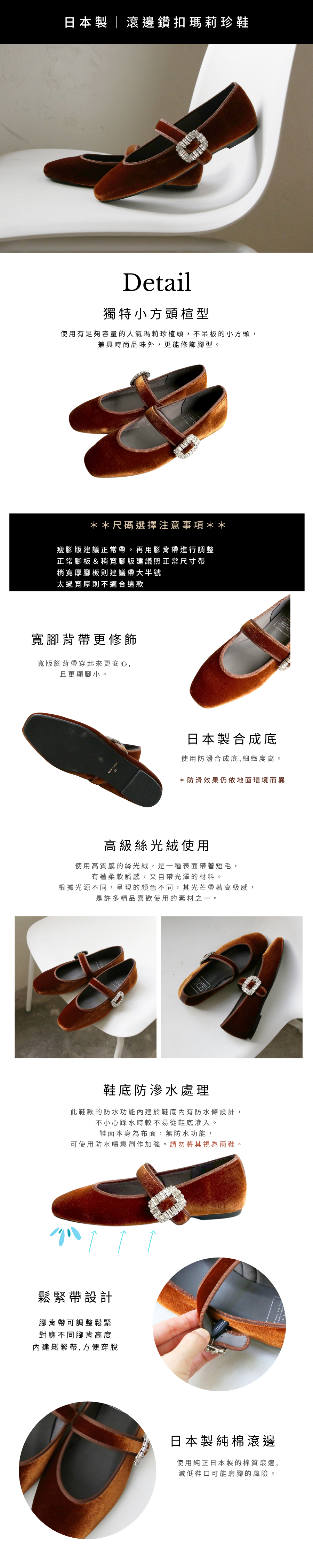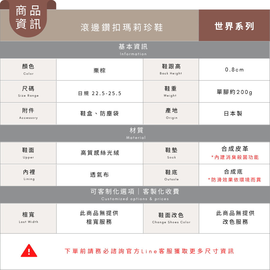 商品詳情 因工期較長,換貨又需重新等待40-60工作天 本檔僅提供七天鑑賞期退貨服務,無換貨服務,可接受再下單 【瑪莉珍團購】【栗棕】世界系列_晴雨兩穿_日本製滾邊鑽扣瑪莉珍鞋 TWD $4,080 TWD$ 3,850